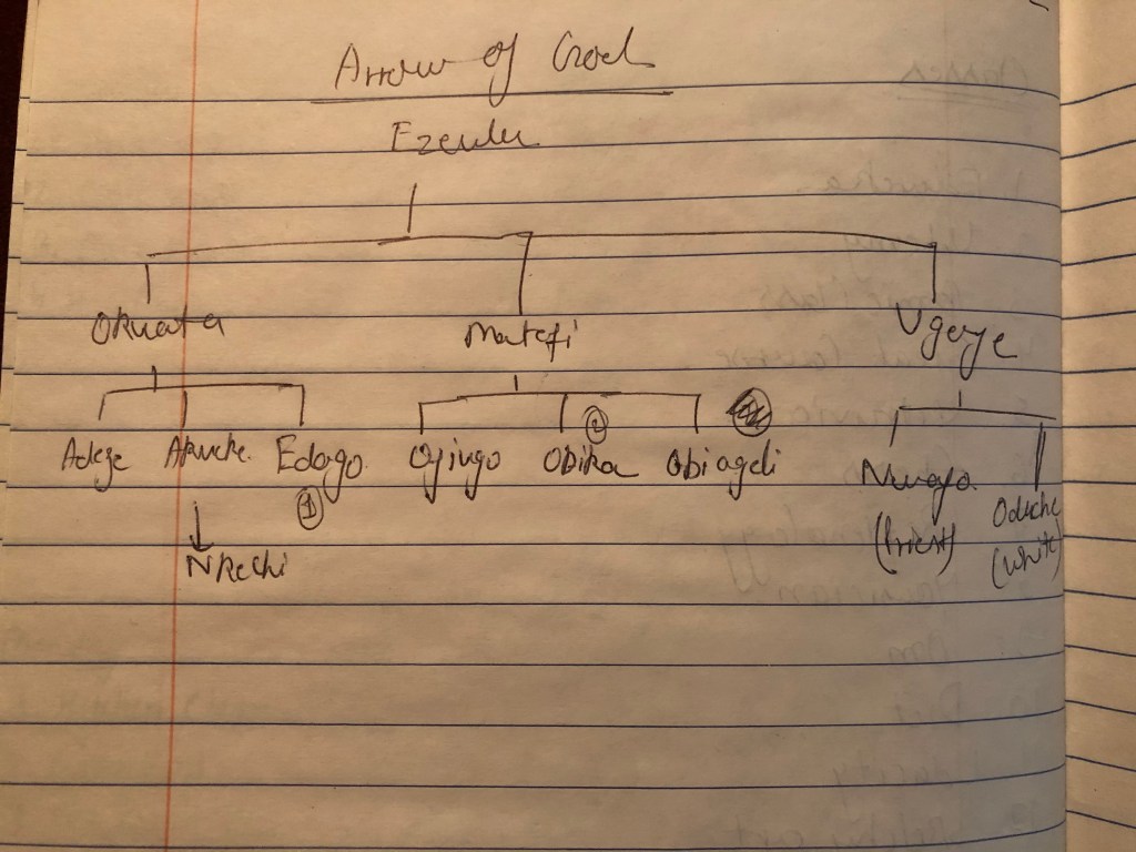 I found that it’s hard to remember the name of characters, so I created family chart of Ezeulu. Attaching that here for reference: